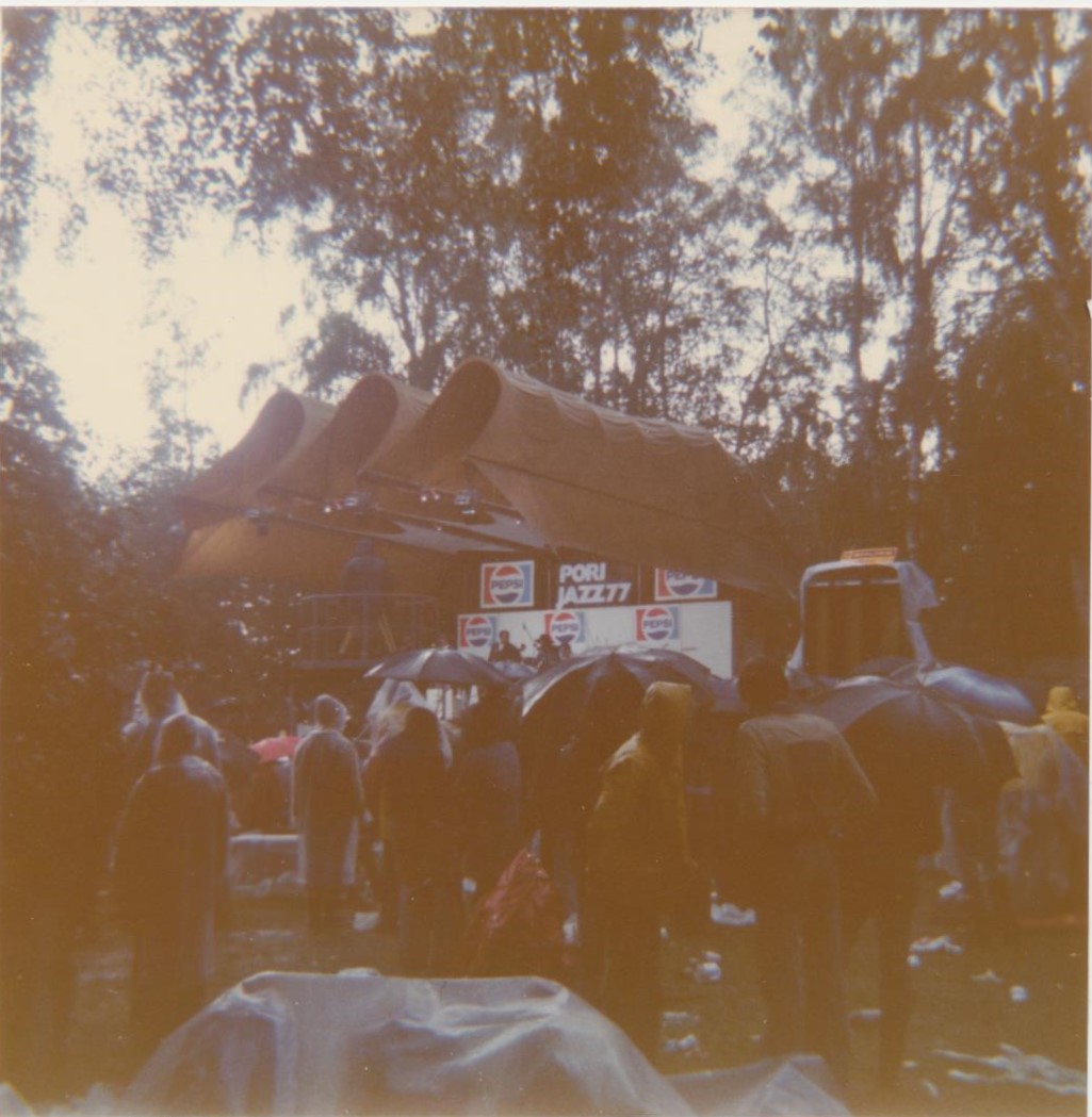 Asuimme Ruotsissa, mutta olimme suomalaisten ystävien kanssa päättäneet lähteä Poriin jazzia kuuntelemaan, olihan siellä tasokkaita esiintyjiä. Yöpyminen oli leirintäalueella. Ilmeisesti etukäteen oli luvattu viileää ilmaa, joten olimme varustautuneet sekä villatakein että sadevarustein. Kunnon jazzystäväähän ei sade haittaa, jos on oikeat varusteet.